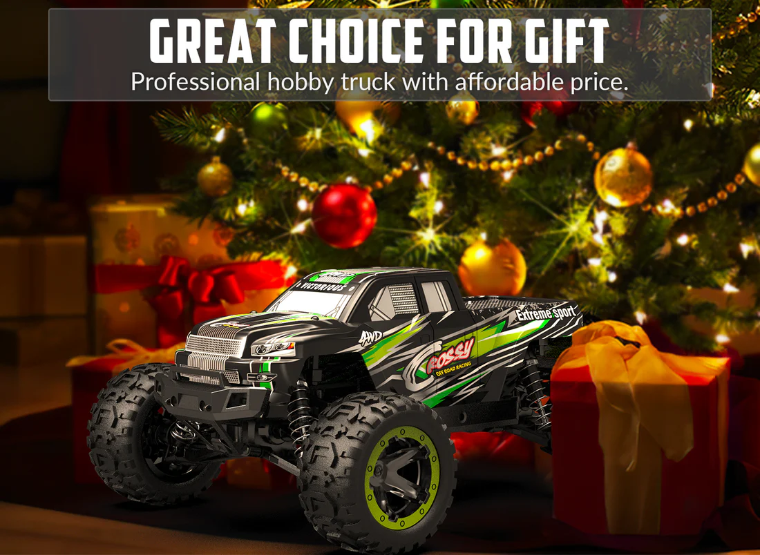 This RC truck is designed for both beginners and enthusiasts who want a ready-to-go machine that offers real off-road capability and speed. The 1:16 scale makes it compact and portable, yet the 4WD system and durable build mean it won’t shy away from rough surfaces, slopes and outdoor terrain. The inclusion of dual 7.4 V lithium batteries means you get extended run time right from the start. Whether you’re racing across a beach, tearing up grass or tackling rocky trails, this monster truck packs the features to deliver fun and performance.